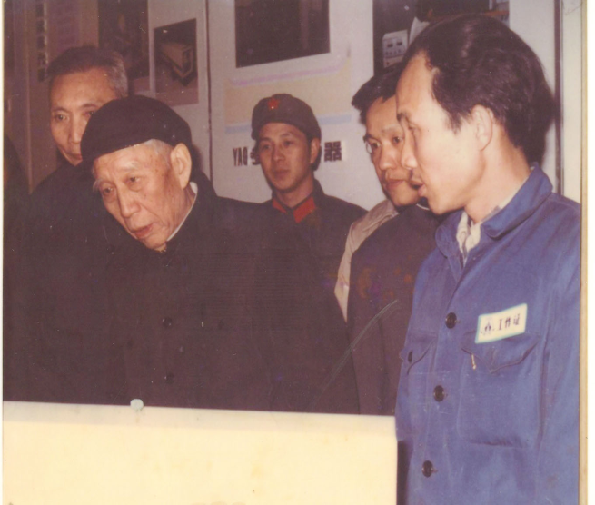 1982年國(guó)家副主席王震參觀廣州電子所研制的全國(guó)第一臺(tái)封離型氮分子激光器。